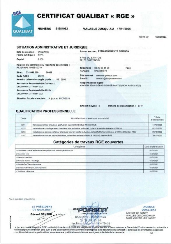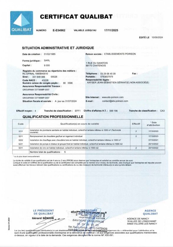 Qualification Qualibat - La valorisation des compétences professionnelles et des capacités de l'entrepriseQualifications attribuées par l'organisme QUALIBAT(certificat n° E-E54962 valable jusqu'au 17/11/2025)
